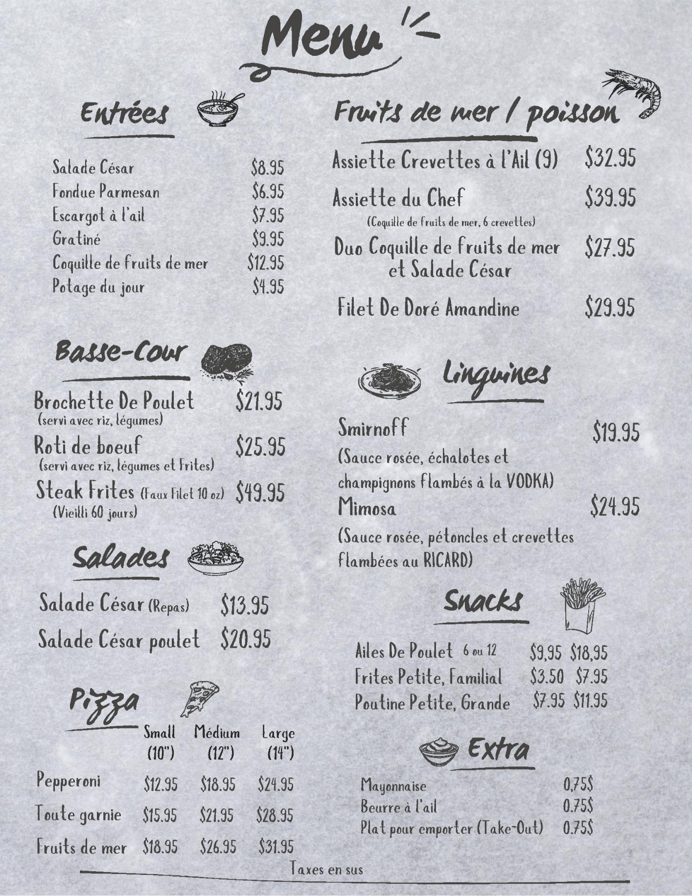 Notre restaurant a tout pour plaire aux amateurs de bons repas à des tarifs plus qu’abordables. De l’entrée au dessert, laissez vos papilles se délecter de mets gastronomiques tout autant que de lunchs style bistro. Nos cuisiniers passionnés se font toujours une joie de vous offrir des assiettes qui mettent l’eau à la bouche et qui font la satisfaction des amoureux du bon goût culinaire.